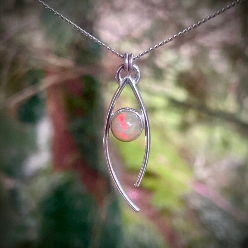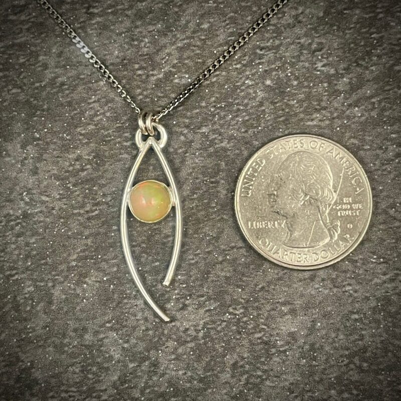 Slender, sterling silver pendant with colorful opal, offering flashes of reds and greens and yellows. Wear as an everyday necklace, or for getting dressed up. Pair with a slim pair of minimalist earrings.