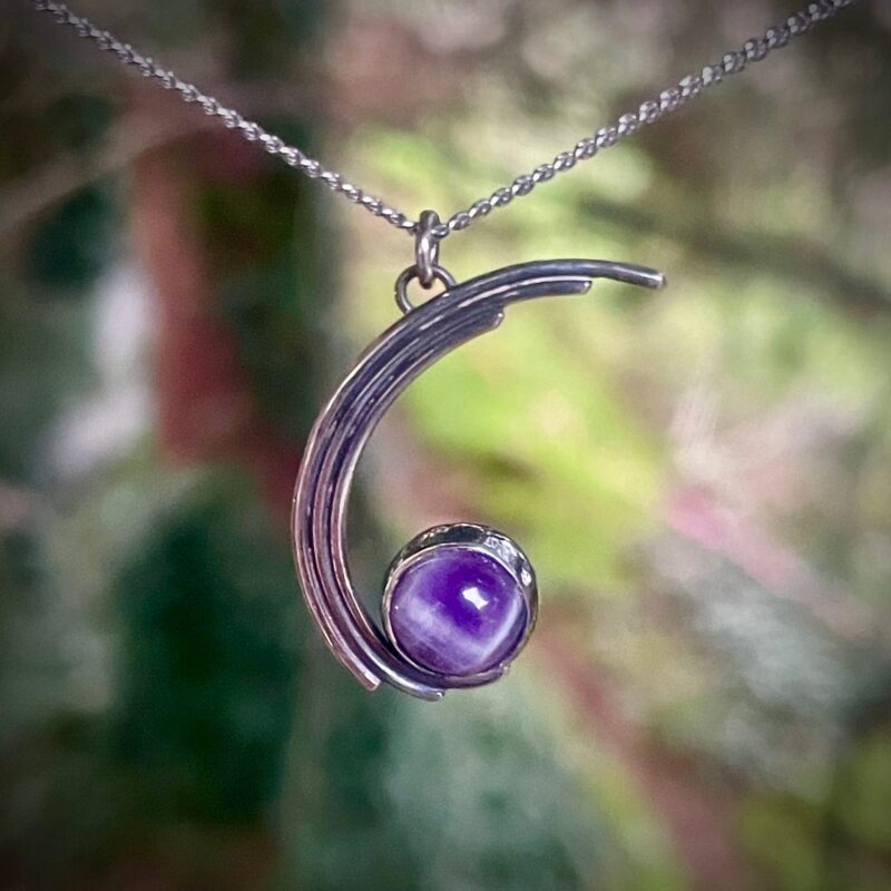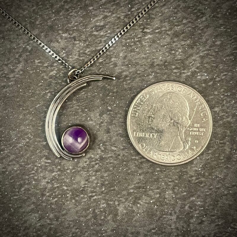 This abstract moon pendant cradles a bright purple and white amethyst. Embodying asymmetric balance and the graceful curves of nature, Purple Moon has the simplicity to wear every day, or as a splash of color with something more formal.