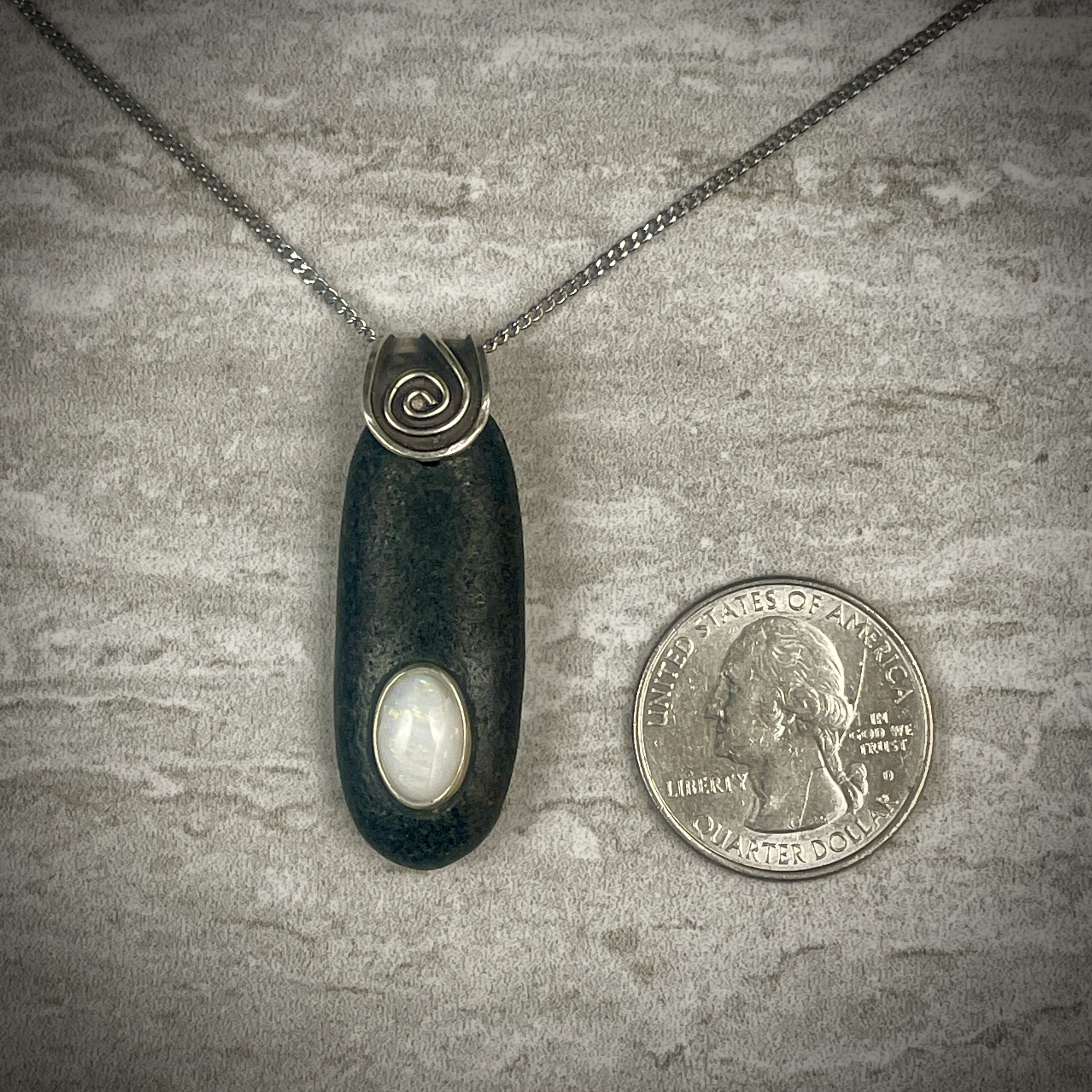 Spiral of life embodies the energy of ancient beliefs. Our lives are a journey along a curving path unfolding in infinite ways. The basalt beach stone possess the motion of the Pacific ocean that rolled and polished it over thousands of years, much like the ever evolving path of life. An inlaid opal brings a little flash and refinement to the piece.